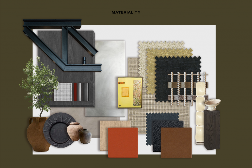 The material palette is intentionally restrained, featuring natural finishes, timber, and lush planting, contrasted by bold injections of colour and personality through furniture and accessories, developed in collaboration with Dodds & Shute. Concrete screed flooring adds an industrial edge, complemented by dark timber, deep bronze tones, and woven rattan rugs that introduce warmth and texture.