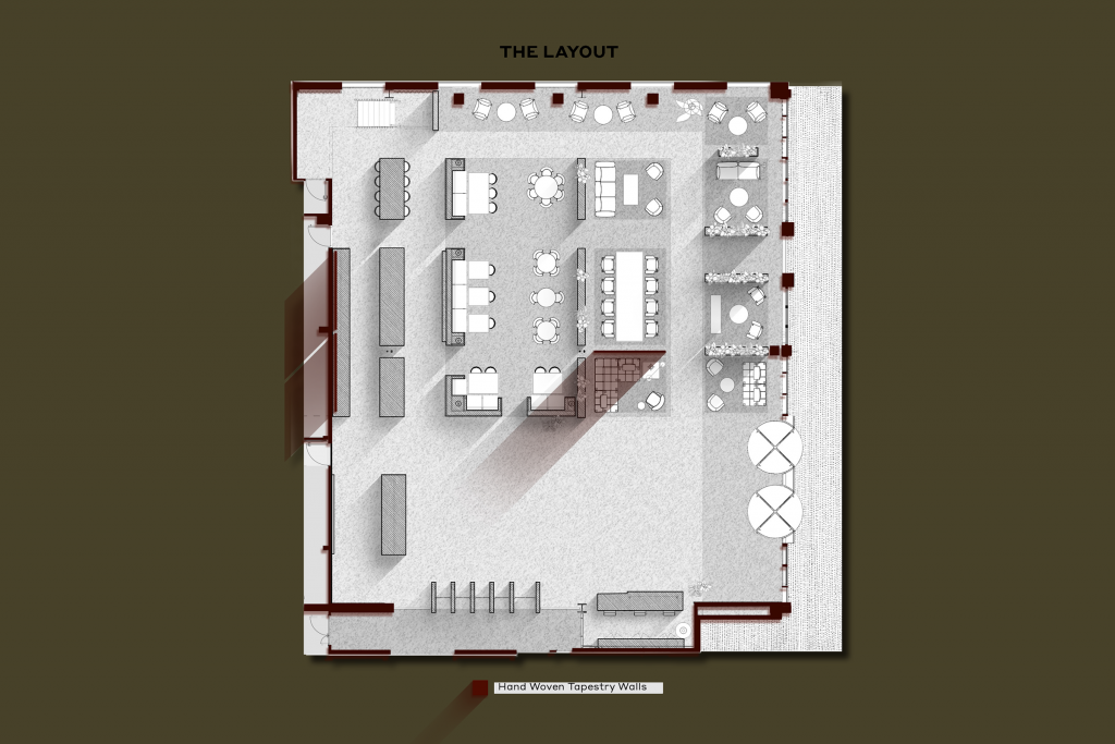 Strategically placed banquettes provide a sense of intimacy and separation from the café, while a series of dynamic installations cascading from ceiling to floor subtly define areas, creating an evolving play of light and shadow. Crafted from natural materials, including sisal and cotton in muted tones, the installations create contrasts and textures and celebrate raw craftsmanship.